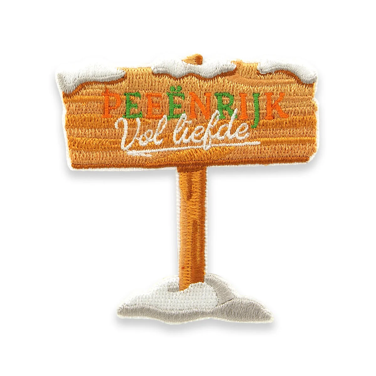 Met de “Peeënrijk Liefde” patch laat je zien waar jouw carnavals­hart ligt. Het speelse ontwerp in de vorm van een houten wegwijzer, met een laagje sneeuw bovenop, staat symbool voor warmte, saamhorigheid en natuurlijk: liefde voor het Peeënrijk.